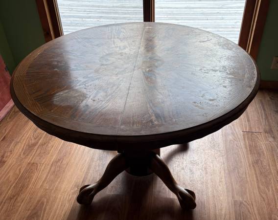 Solid wood dining room table with leaf. Quality construction. Unique claw feet. Refinish it, paint it or just use a table cloth to cover blemishes.